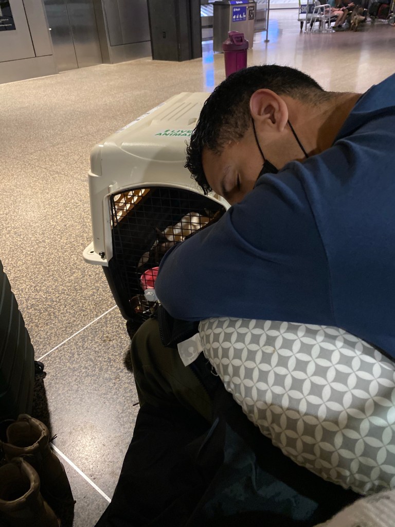 This was something that we didn’t know until after checking our baggage. We got to the airport SO early (left the hotel at 10:30 pm for an 8:00 am flight) for a lot of reasons, the biggest one was to make sure we were first in line for our COVID tests (which started at 1:00 am). You technically are supposed to get them before you arrive at the airport but for a lot of reasons, (primarily that most places wouldn’t test our children) we had to get them at the airport. Secondly, because we had so much stuff and so many creatures, we decided we would rather be settled and waiting at the airport than rushing when the line got longer. Anywho after checking in they told us we had to wait outside of baggage claim (which means not going through security yet) until 6:00 am when they would pick up all the dogs. I didn’t mind waiting so much as I wished we had brought a full meal and lots of coffee. There were food options outside of security, but none of it was open except the vending machines.