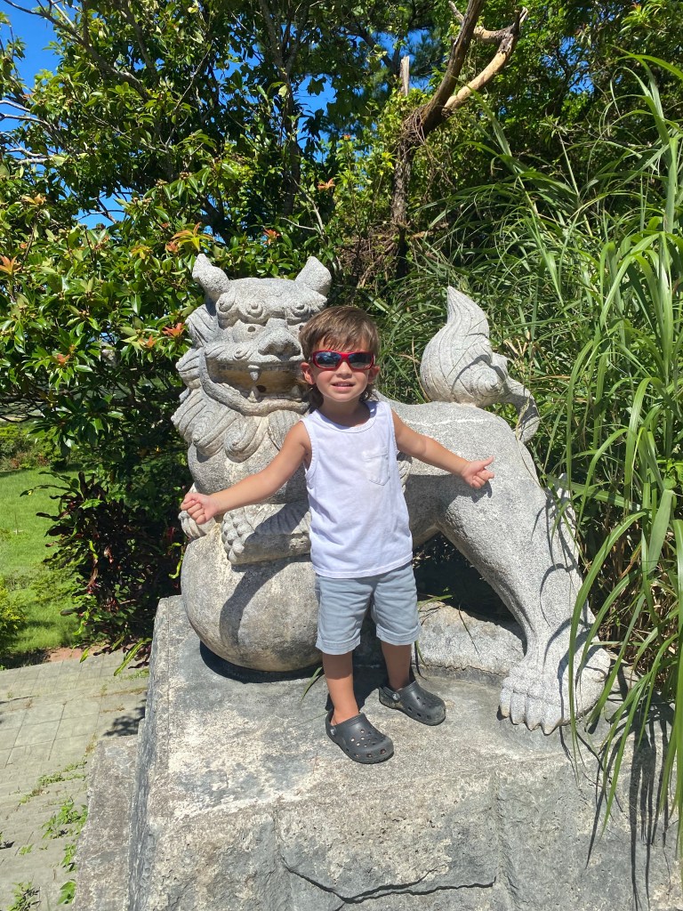 It’s not too bad of a walk from the parking lot up to the castle area, a big open road, but the walk is uphill and gets just a little steep. The two-year-old didn’t complain too much but I also might have carried him the last little bit of the way. The cool statues and structures along the way helped motivate him though. There was a vending machine right by the parking lot so we grabbed juice before starting the walk. A fair amount of spiders were on this walk but it was also pretty shaded on a very hot day, so it evens out.
